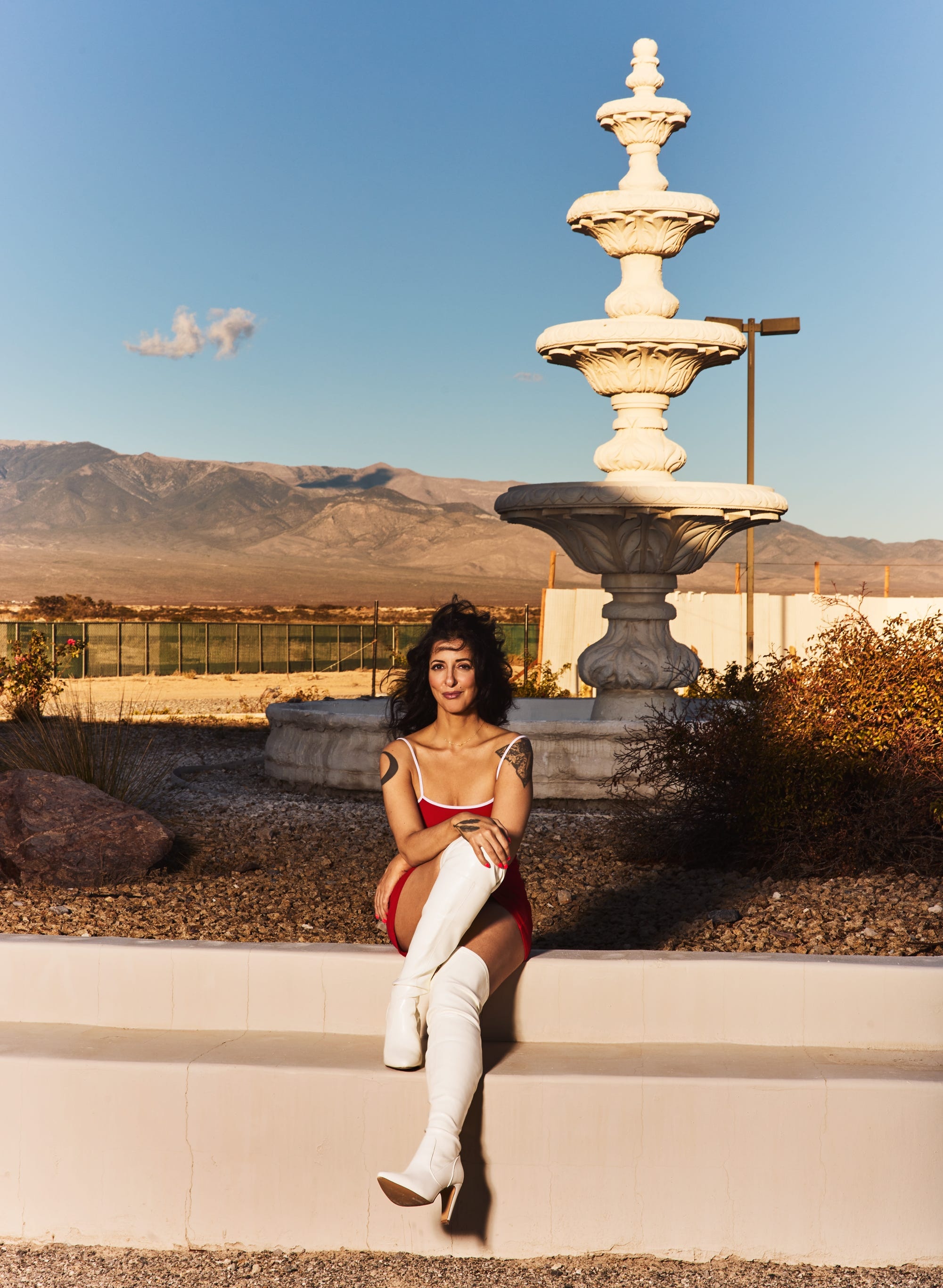A autora em frente ao Sheri’s Ranch. Situado no deserto, a poucos quilómetros da fronteira com a Califórnia, o bordel atrai clientes abastados de Los Angeles e Las Vegas.