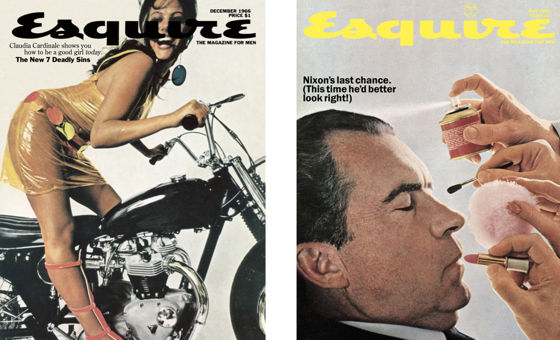 Esquerda: Esquire US dezembro de 1966 – CLAUDIA CARDINALE. Direita: Esquire US maio de 1968 – NIXON. O homem que perdeu uma eleições por ser feio, deu origem à capa mais cosmética da história.