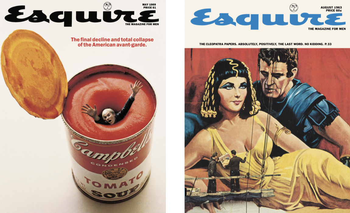 Esquerda: Esquire US maio de 1969 – ANDY WARHOL. Andy Warhol chegou a estar clinicamente morto, depois de ser baleado pela feminista Valerie Solanas na Factory. Lutando por não se afogar na sopa Campbell, em Maio de 1968 foi capa da Esquire. Direita: Esquire US agosto de 1963 – RICHARD BURTON e ELIZABETH TAYLOR em Cleopatra. Durante as filmagens de Ceopatra, ninguém percebia como era possível gastar 10 milhões num filmes. A Esquire revelou como se ultrapassaram os 30M.